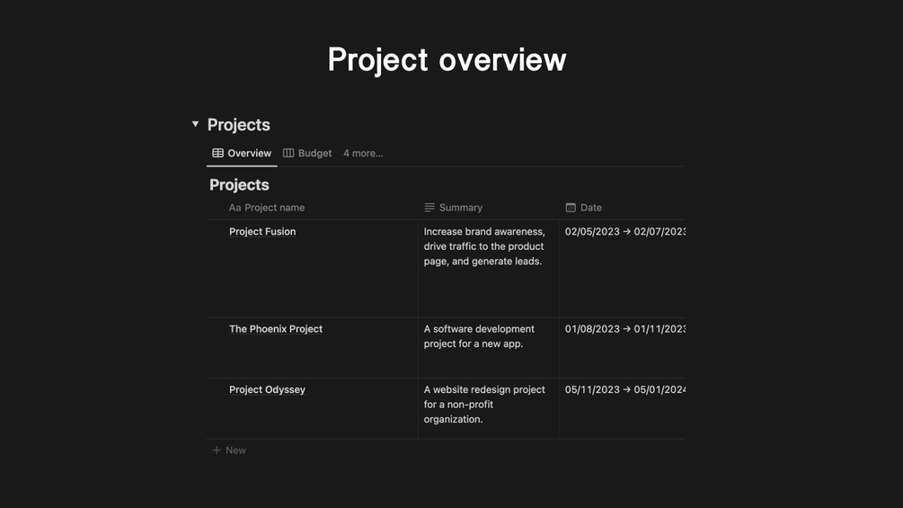 • A comprehensive view of your project's details and objectives with the project's name and summary of deadlines.